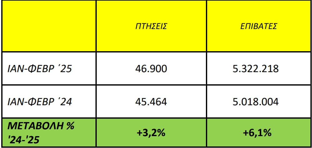 Αύξηση 6,1% σημειώθηκε στην επιβατική κίνηση το πρώτο δίμηνο του 2025 στο σύνολο των 39 αεροδρομίων της χώρας, που διεξάγονται εμπορικές πτήσεις (24 αεροδρόμια της Υπηρεσίας Πολιτικής Αεροπορίας – ΥΠΑ, 14 της Fraport Greece και το αεροδρόμιο της Αθήνας).