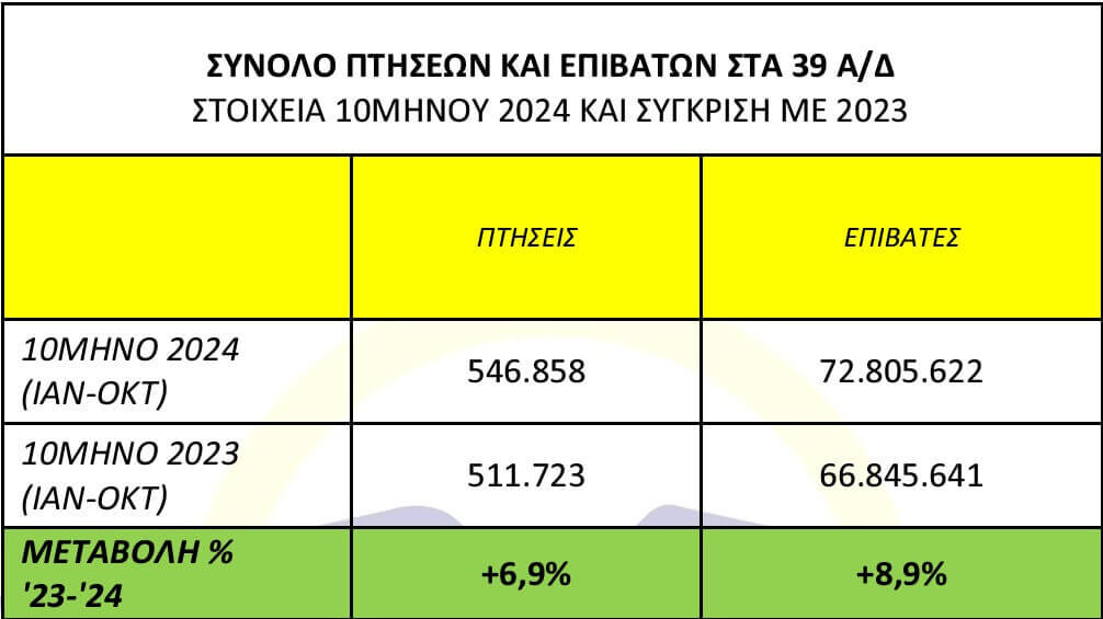 Ειδικότερα, σύμφωνα με τα στατιστικά στοιχεία: Το σύνολο των επιβατών (αφίξεις και αναχωρήσεις επιβατών εξωτερικού και εσωτερικού) το πρώτο 10μηνο του 2024 ανήλθε στους 11.295.034 επιβάτες, έναντι 10.573.944 επιβατών το αντίστοιχο διάστημα του 2023.