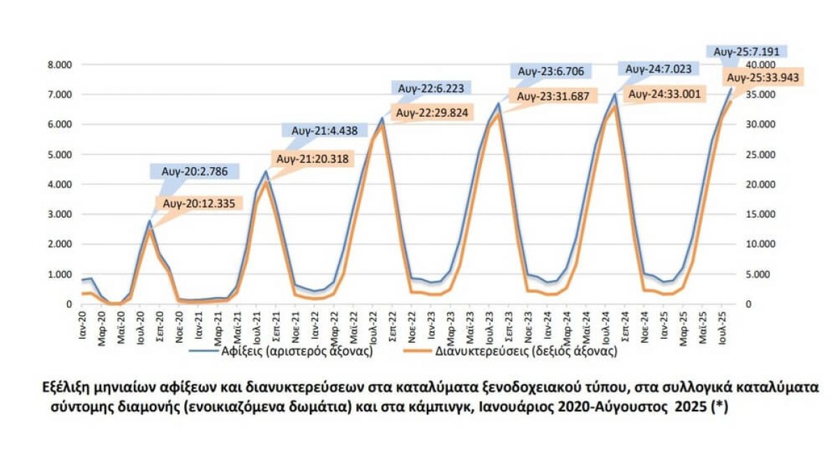 Aπό τα μηνιαία στοιχεία προκύπτει ότι το 84,9% των αφίξεων και το 92,3% των διανυκτερεύσεων στα καταλύματα ξενοδοχειακού τύπου και στα κάμπινγκ της χώρας, συγκεντρώνεται το διάστημα από Απρίλιο έως και Οκτώβριο, καταδεικνύοντας την ανάγκη καταπολέμησης της εποχικότητας και της επέκτασης της τουριστικής περιόδου.