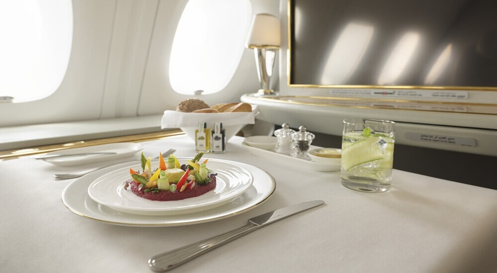 Δίνοντας έμφαση στη δέσμευσή της για γαστρονομική αριστεία για όλους τους πελάτες, η Emirates προσφέρει vegan γεύματα σε όλες τις κατηγορίες θέσης, καθώς και συμπληρωματικά προϊόντα όπως φυτικό γάλα. Υποστηρίζοντας τη φιλοσοφία «από το αγρόκτημα στο τραπέζι», η Emirates ενσωματώνει φρέσκα προϊόντα από τη Bustanica – τη μεγαλύτερη υδροπονική φάρμα κάθετης καλλιέργειας στον κόσμο. Η φάρμα αποτελεί κοινό εγχείρημα με την Emirates Flight Catering και παρέχει φυλλώδη λαχανικά, όπως μαρούλι, ρόκα, ανάμεικτα σαλατικά και σπανάκι, χωρίς φυτοφάρμακα και χημικά, απευθείας στις εγκαταστάσεις τροφοδοσίας της Emirates.