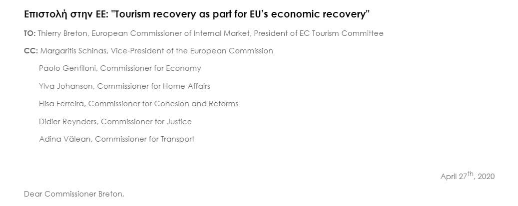 Ο Σύνδεσμος Ελληνικών Τουριστικών Επιχειρήσεων (ΣΕΤΕ), σε συνεργασία με τους τουριστικούς συνδέσμους από τη Γερμανία (Bundesverband der Deutschen Tourismuswirtschaft), την Ιταλία (FEDERTURISMO CONFINDUSTRIA) και τη Νορβηγία (Norwegian Tourism Partners), απέστειλε επιστολή με τίτλο: «Τourism recovery as part for EU’s economic recovery», στον Επίτροπο Τιερί Μπρετόν, αρμόδιο για την Εσωτερική Αγορά και πρόεδρο της Επιτροπής Τουρισμού της Ευρωπαϊκής Ένωσης, στην οποία αναλύονται τα ζητούμενα και τα αιτήματα για την επόμενη ημέρα.
