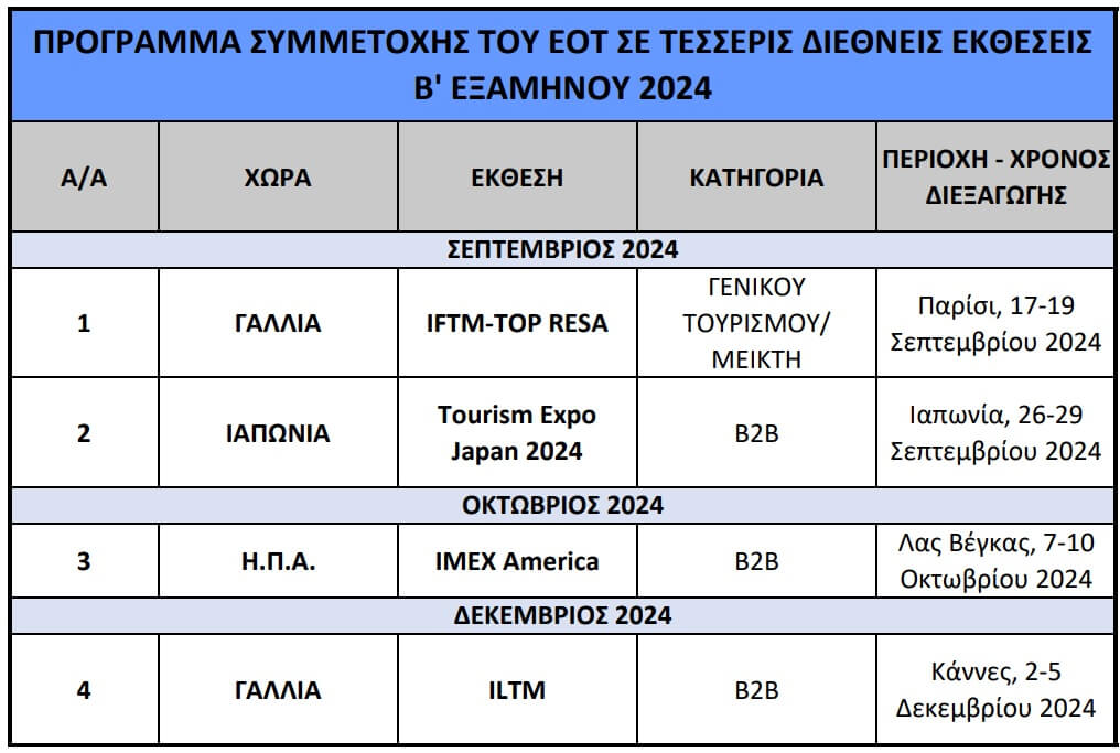 Ο Ελληνικός Οργανισμός Τουρισμού (ΕΟΤ), στο πλαίσιο του προγράμματος προβολής της Ελλάδας ως τουριστικός προορισμός στο εξωτερικό, θα συμμετάσχει μέχρι το τέλος του 2024 στις παρακάτω διεθνείς τουριστικές εκθέσεις: