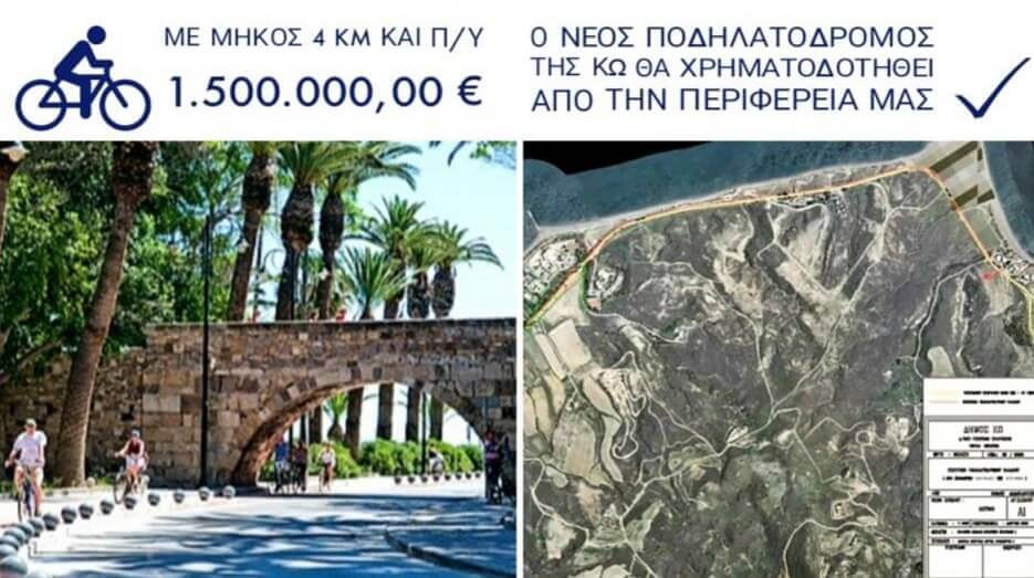 Η Περιφέρεια Νοτίου Αιγαίου θα χρηματοδοτήσει εξ ολοκλήρου με το ποσό των 1,5 εκατ. ευρώ (συμπεριλαμβανομένου ΦΠΑ) το έργο της επέκτασης του ποδηλατόδρομου, μήκους τεσσάρων χιλιομέτρων από το ξενοδοχείο «Sun Palace» έως το ξενοδοχείο «Δήμητρα», στο Ψαλίδι της Κω, με σκοπό την καθιέρωση της Κω ως ποδηλατικού προορισμού.