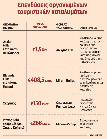 Επενδυτικά σχέδια για τη δημιουργία μεγάλων 5άστερων ξενοδοχειακών συγκροτημάτων, που θα ξεπεράσουν τα 8 δισ. ευρώ, δρομολογούνται στον τουριστικό κλάδο τα επόμενα χρόνια.