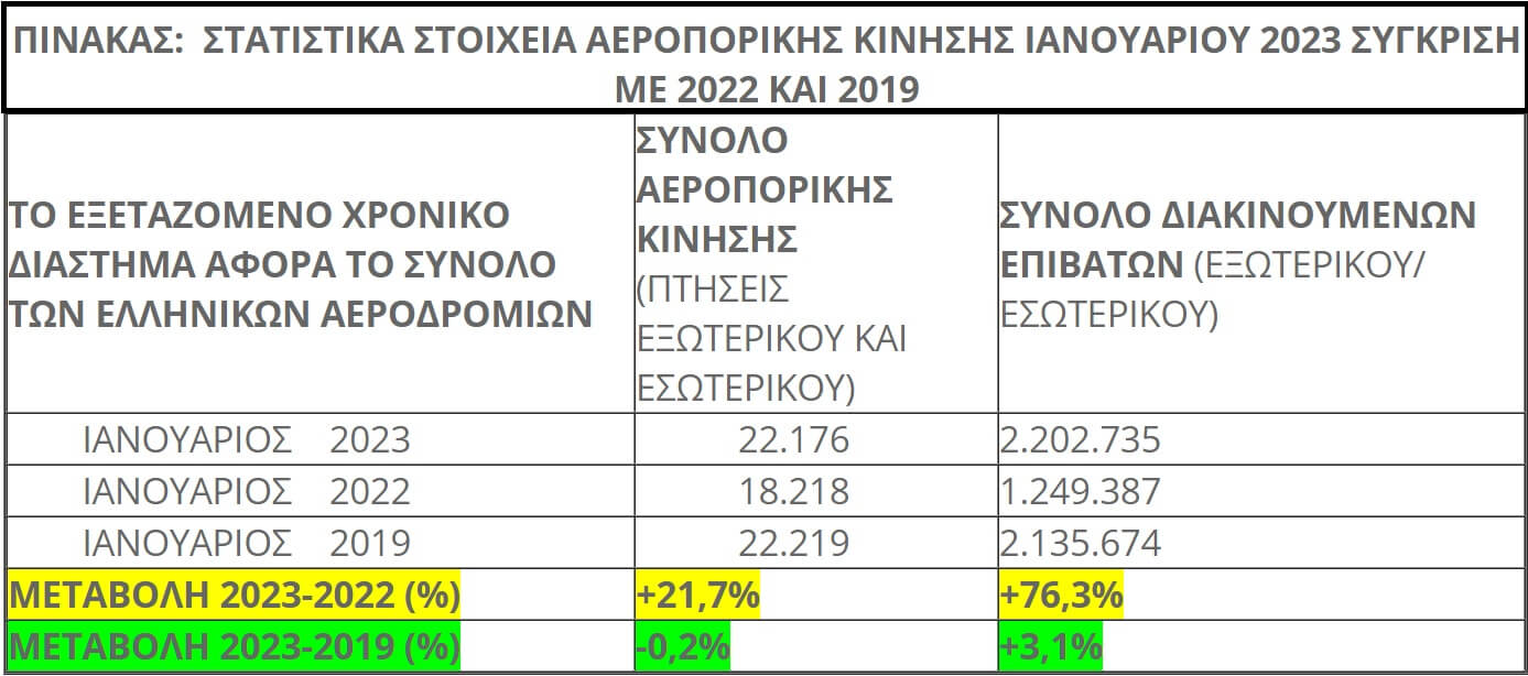 Να σημειωθεί ότι καταγράφεται οριακή μείωση των πτήσεων τον Ιανουάριο του 2023 σε σχέση με τον Ιανουάριο του 2019, αλλά αύξηση της διακίνησης των επιβατών λόγω χωρητικότητας και πληρότητας των αεροσκαφών.
