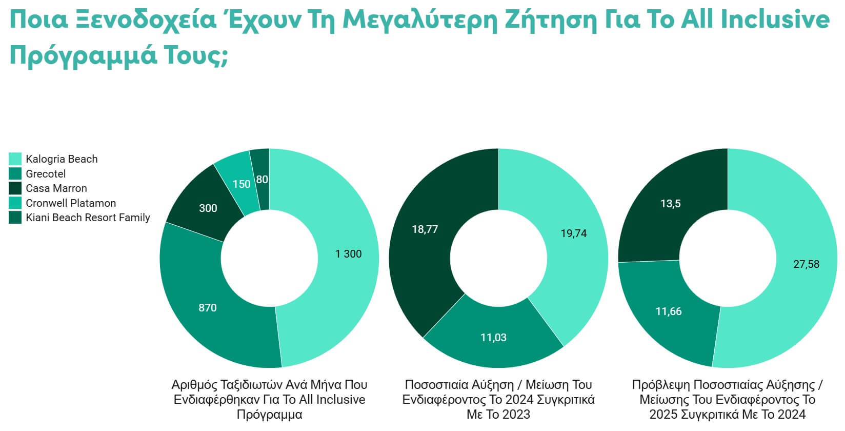Συγκεκριμένα σημειώθηκε αύξηση κατά 444,3% του ενδιαφέροντος για διακοπές σε all-inclusive ξενοδοχεία σε σχέση με το 2023, ενώ μεγάλη αναμένεται να είναι η αύξηση και το 2025.