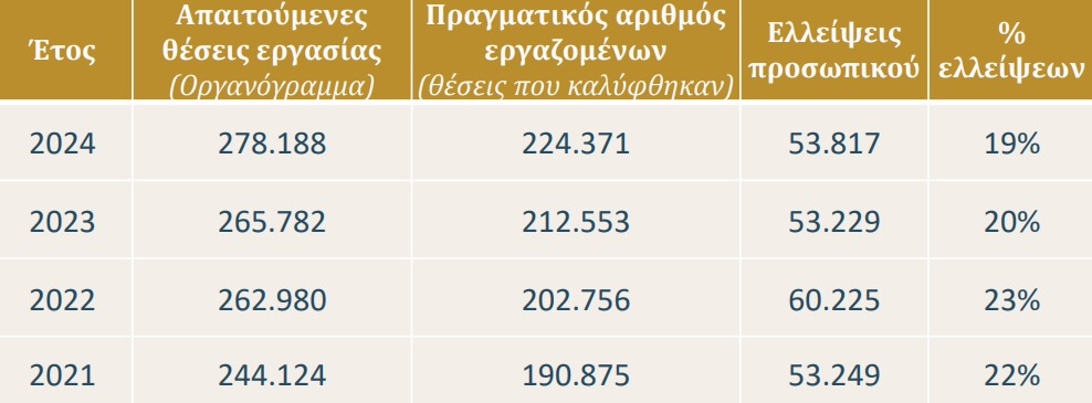 Από την έρευνα προκύπτει ότι για το έτος 2024, οι ελλείψεις προσωπικού εκτιμώνται στις 53.817 έναντι των 278.188 θέσεων εργασίας που προβλέπονται στο οργανόγραμμα.