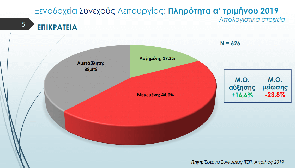 Σύμφωνα με την Έρευνα, με τίτλο: «Επιδόσεις ξενοδοχείων κατά το α’ τρίμηνο και προβλέψεις για την τουριστική σεζόν 2019» -που πραγματοποιήθηκε σε δείγμα 1.956 ελληνικών ξενοδοχείων σε σύνολο 9.873, το 45% των μονάδων συνεχούς λειτουργίας παρουσίασε μειωμένη πληρότητα, ενώ 1 στα 4 ξενοδοχεία εμφάνισε μείωση στις τιμές του.