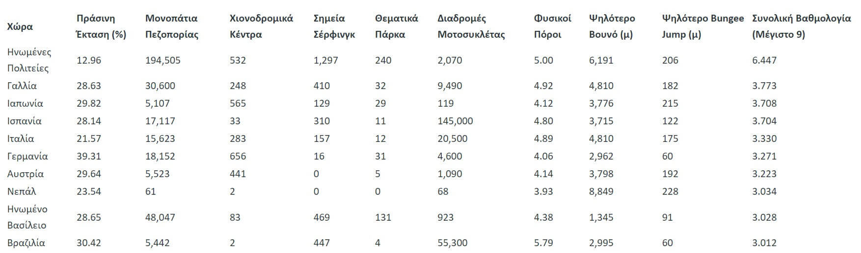 Οι Ηνωμένες Πολιτείες και η Γαλλία κατέλαβαν τις δύο πρώτες θέσεις, με τις Η.Π.Α. να ηγούνται σε μονοπάτια πεζοπορίας (εντυπωσιακά 194.505 χλμ.) και σημεία για σέρφινγκ (1.297).