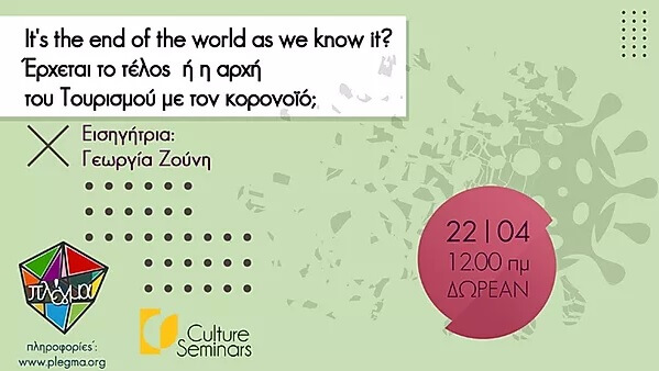«It’s the end of the world as we know it? Έρχεται το τέλος ή η αρχή του Τουρισμού με τον κορονοϊό?»: Είναι ο τίτλος του διαδικτυακού σεμιναρίου με εισηγήτρια τη Γεωργία Ζούνη.