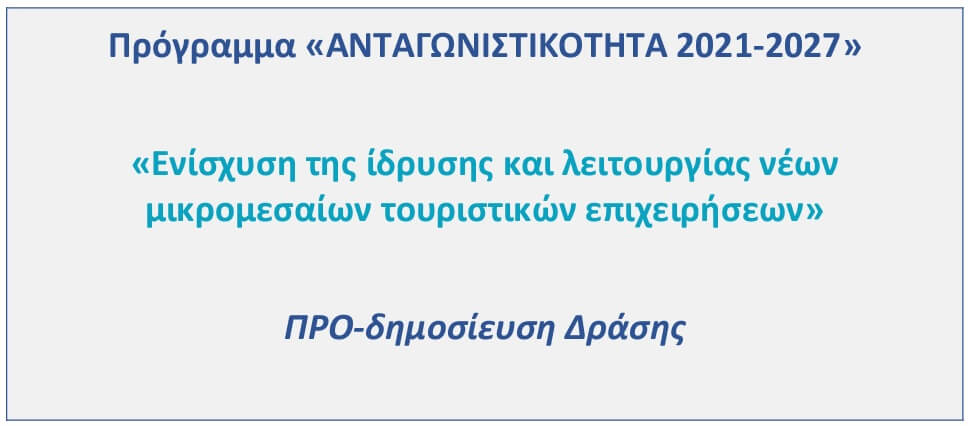Προδημοσιεύτηκε η Δράση «Ενίσχυση της ίδρυσης και λειτουργίας νέων μικρομεσαίων τουριστικών επιχειρήσεων», η οποία αφορά στην ενίσχυση της τουριστικής επιχειρηματικότητας μέσω της δημιουργίας νέων πολύ μικρών, μικρών και μεσαίων επιχειρήσεων επιλεγμένων ΚΑΔ του τουρισμού.