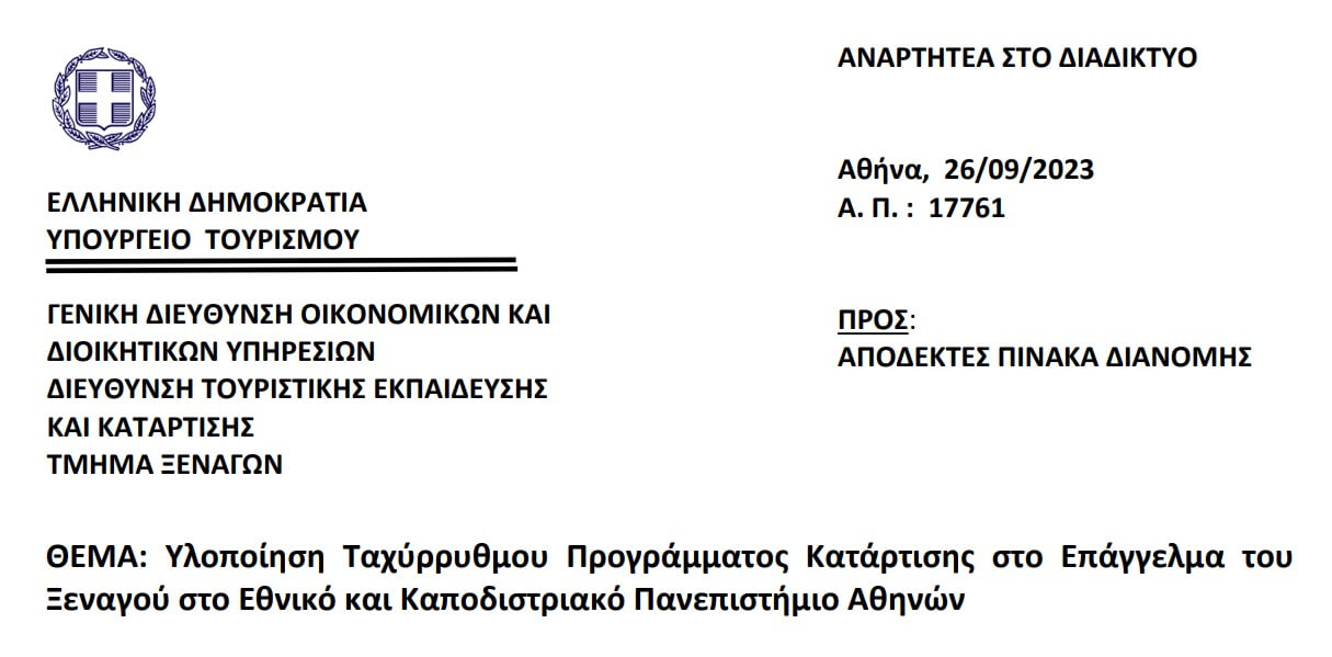 Το Υπουργείο Τουρισμού ανακοίνωσε την έναρξη Ταχύρρυθμου Προγράμματος Κατάρτισης στο Επάγγελμα του Ξεναγού στο Εθνικό και Καποδιστριακό Πανεπιστήμιο Αθηνών, διάρκειας δύο μηνών.