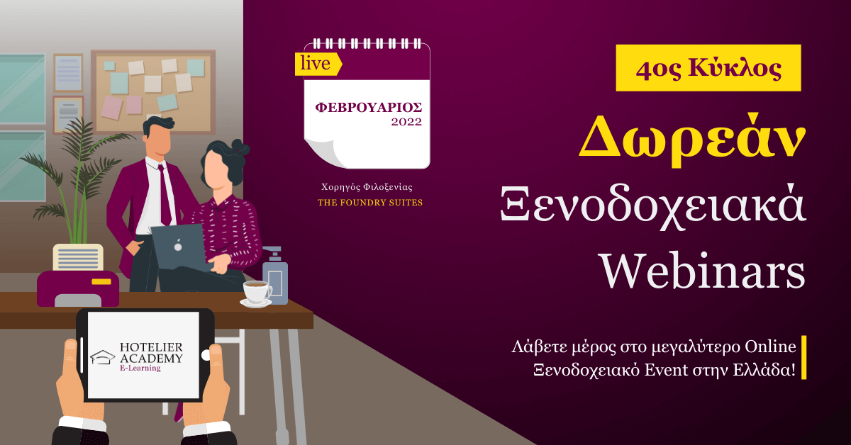 Το Φεβρουάριο θα διεξαχθεί ο τέταρτος κύκλος των Δωρεάν Live Webinars της Hotelier Academy, κατά τη διάρκεια των οποίων, κορυφαίοι επαγγελματίες του χώρου, θα παρουσιάσουν ξενοδοχειακές εκπαιδευτικές θεματικές πάνω στη λειτουργία, πώληση αλλά και διαχείριση ενός καταλύματος, με στόχο πάντα την ενίσχυση της τεχνογνωσίας τόσο των εργαζομένων σε Ξενοδοχεία, όσο και των ίδιων των ξενοδόχων.