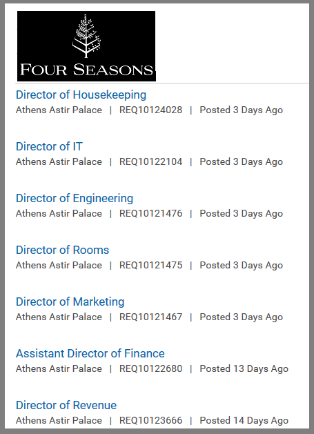 Η διεθνής ξενοδοχειακή αλυσίδα Four Seasons Hotels and Resorts, που όπως ανακοινώθηκε στις αρχές Σεπτεμβρίου αναλαμβάνει τη διαχείριση (management) του Αστέρα Βουλιαγμένης, που θα λειτουργήσει ως «Four Seasons Astir Palace Hotel Athens», με την ολοκλήρωση των έργων ριζικής ανακαίνισης – ανακατασκευής των εγκαταστάσεων το Μάιο του 2018, ζητά διευθυντικά στελέχη για το θρυλικό ξενοδοχειακό συγκρότημα της Βουλιαγμένης: