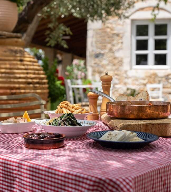 Η ναυαρχίδα της ελληνικής κουζίνας, το ελαιόλαδο, δίνει τη θέση της σε ένα λαχταριστό πιάτο καγιανά σε μια παραδοσιακή ελληνική αυλή.