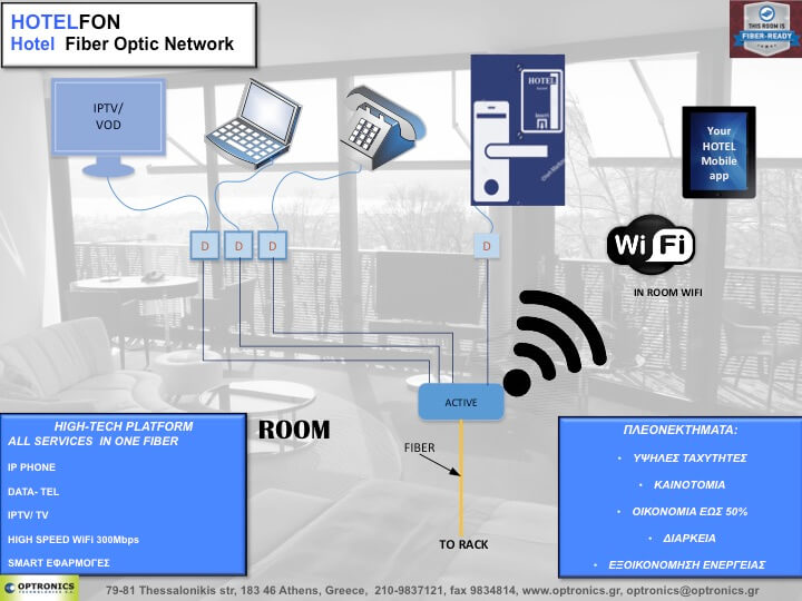 Το GPON-HOTELFON προσφέρει όλες τις Υπηρεσίες όπως ΙΡ Tηλεφωνία στα δωμάτια, ΙΡTV για δορυφορικά, συνδρομητικά και επίγεια κανάλια, Data – Internet στα δωμάτια, τους κοινόχρηστους χώρους και τα γραφεία Διοίκησης. Υπάρχει επίσης ειδική υπηρεσία Private WiFi στα δωμάτια για μοναδική εμπειρία σύνδεσης με υψηλή ταχύτητα στο internet, ενώ περιλαμβάνονται και αυτοματισμοί στα δωμάτια όπως Door lock control.