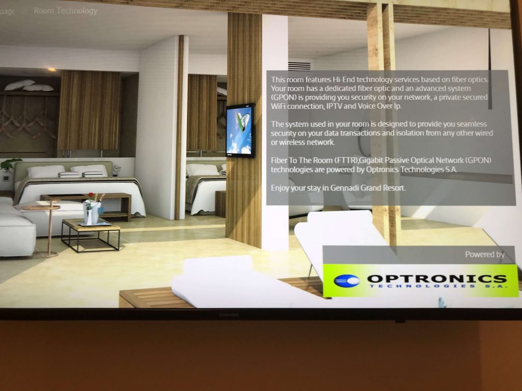 Η εταιρία OPTRONICS TECHNOLOGIES ABETE ανέλαβε τη μελέτη, προμήθεια και εγκατάσταση του ολοκληρωμένου συστήματος GPON-HOTELFON (HOTEL Fiber Optic Network) με οπτικές ίνες σε 320 δωμάτια και όλους τους χώρους του νέου ξενοδοχείου GENNADI GRAND RESORT στη Νότια Ρόδο, που λειτουργεί επιτυχώς ήδη από το Μάιο του 2018.