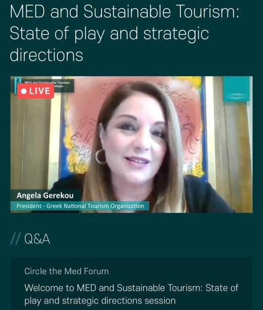 Στην ομιλία της στη διαδικτυακή συνάντηση με θέμα: «Μεσόγειος και Βιώσιμος Τουρισμός: Η σημερινή κατάσταση και οι στρατηγικές κατευθύνσεις», η κα Γκερέκου διαβεβαίωσε ότι «ο ΕΟΤ στηρίζει όλες αυτές τις προσπάθειες, καθώς η βιώσιμη ανάπτυξη θα είναι βασική μας προτεραιότητα και στις καμπάνιες προβολής της χώρας μας».