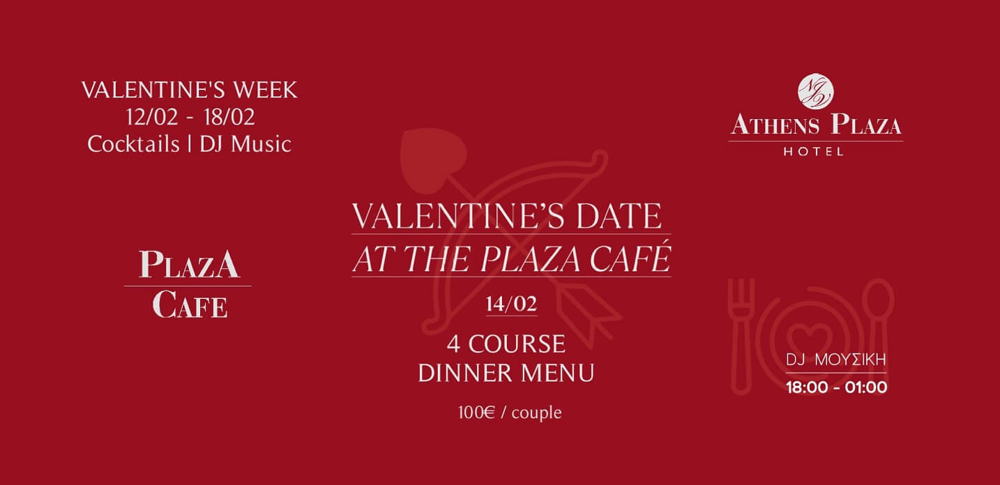 Ενώ την Ημέρα του Αγίου Βαλεντίνου 14/02, τα ερωτευμένα ζευγάρια θα έχουν την ευκαιρία να γιορτάσουν στο Plaza Café με μουσική DJ και να απολαύσουν ένα πλούσιο – 4 course – Δείπνο Gourmet Valentine’s από τον Chef Παναγιώτη Αναστασίου.