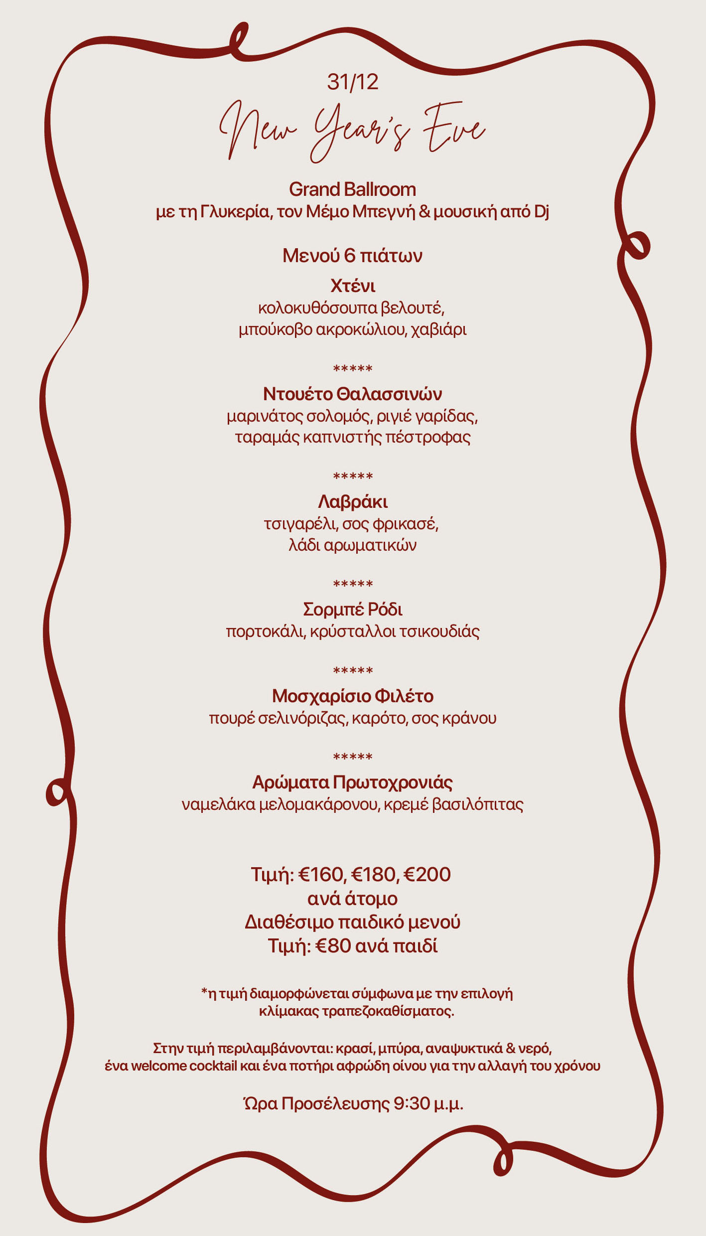 Γιορτάστε τον ερχομό του νέου έτους στο Grand Ballroom, με τη μοναδική παρουσία της Γλυκερίας, αγαπημένα τραγούδια από το Μέμο Μπεγνή και ένα εκλεπτυσμένο μενού έξι πιάτων από τον executive chef Απόστολο Αλτάνη, που σας υπόσχονται μια αξέχαστη Πρωτοχρονιά.