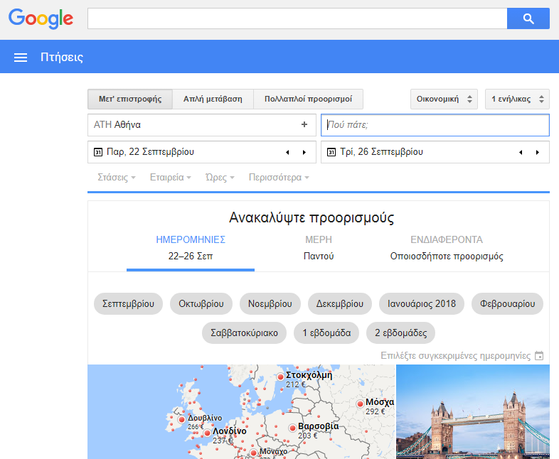 Ας υποθέσουμε πως σχεδιάζετε ένα ταξίδι από την Αθήνα προς το Λονδίνο. Δεν σας πειράζει να ταξιδέψετε με οποιαδήποτε αεροπορική εταιρεία, ενώ είστε ευέλικτοι στις ημερομηνίες. Το Google Flights θα σας προτείνει εναλλακτικά αεροδρόμια ή ημερομηνίες πτήσεων που θα μειώσουν τα έξοδά σας, ενώ θα σας παρέχει συνεχώς πληροφορίες σχετικά με το πότε είναι πιο πιθανό να αυξηθούν οι τιμές των εισιτηρίων και πόσο.