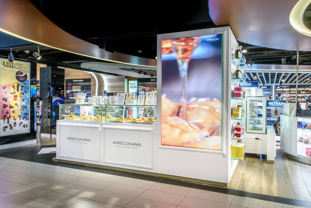Οι επισκέπτες επιλέγουν τα λαχταριστά εδέσματα, ποτά, το λάδι και το μέλι της φάρμας AgrecoFarms βλέποντας ταυτόχρονα όλη τη διαδικασία παραγωγής τους στο ενσωματωμένο στο περίπτερο video wall και τα παραλαμβάνουν σε κομψές συσκευασίες, προορισμένες για ίδια χρήση ή για δώρο.