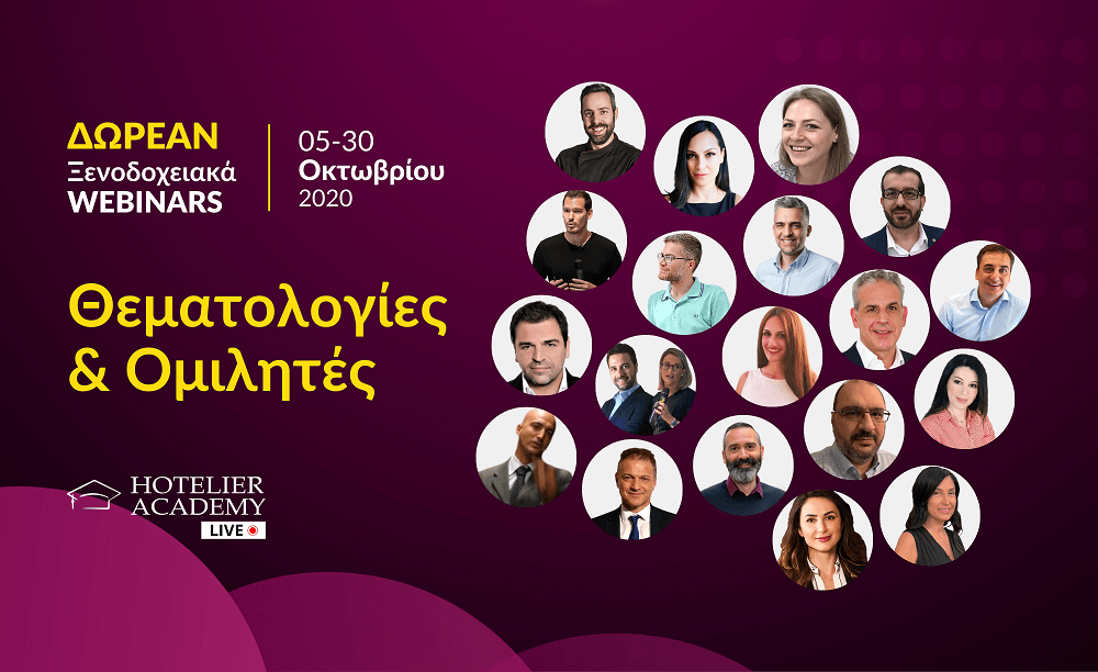 Η Hotelier Academy, ανακοίνωσε τις 19 πρώτες θεματολογίες των δωρεάν ξενοδοχειακών webinars που επανέρχονται το διάστημα 5 – 30 Οκτωβρίου, με νέους ομιλητές αλλά και θεματικές, δίνοντας έμφαση στο ξενοδοχειακό management, τις σύγχρονες F&B διαδικασίες, αλλά και σε μια σειρά από live courses σχετικά με τις πωλήσεις και το digital marketing των ξενοδοχείων.