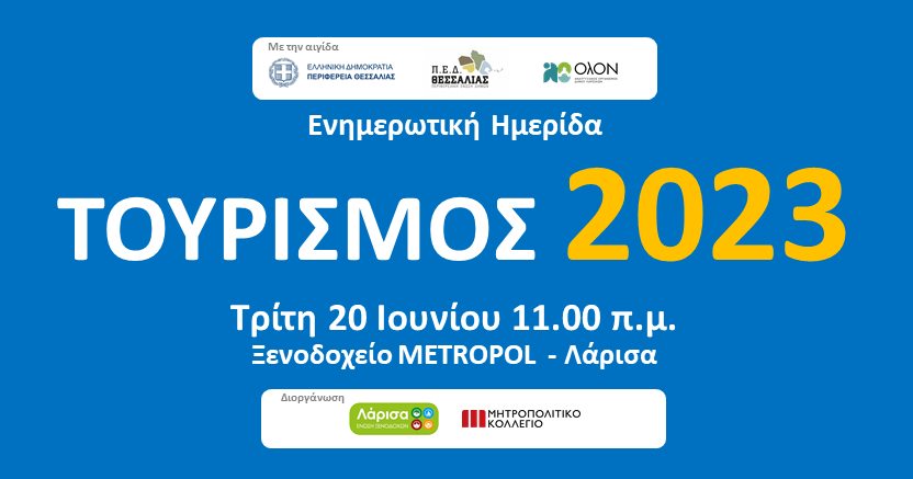 Η Ένωση Ξενοδόχων Ν. Λάρισας σε συνεργασία με το Μητροπολιτικό Κολλέγιο, με τη συμμετοχή της Περιφέρειας Θεσσαλίας, της Περιφερειακής Υπηρεσίας Τουρισμού του Υπουργείου Τουρισμού, της ΠΕΔ Θεσσαλίας, Δήμων της Περιφερειακής Ενότητας Λάρισας, του Αναπτυξιακού Οργανισμού του Δήμου Λαρισαίων ΟΛΟΝ ΑΕ του ΣΘΕΒ, των Ενώσεων Ξενοδόχων της Θεσσαλίας και άλλων θεσμικών φορέων διοργανώνει την Τρίτη 20 Ιουνίου, στις 11.00 στο ξενοδοχείο Metropol, ημερίδα με τίτλο: «ΤΟΥΡΙΣΜΟΣ 2023».