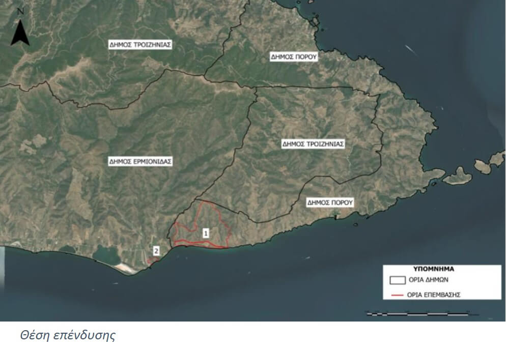 Η επένδυση θα υλοποιηθεί στη θέση «Βλαχέικα» του Δήμου Πόρου της Περιφερειακής Ενότητας Νήσων της Περιφέρειας Αττικής και στη θέση «Μετόχι» του Δήμου Ερμιονίδας της Περιφερειακής Ενότητας Αργολίδας της Περιφέρειας Πελοποννήσου σε συνολική έκταση 1.753,28 στρεμμάτων, απέναντι από την Ύδρα.