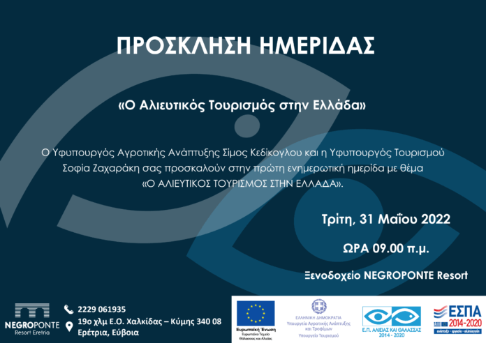 Το Υπουργείο Αγροτικής Ανάπτυξης και Τροφίμων και το Υπουργείο Τουρισμού, σε συνεργασία με την Ειδική Υπηρεσία Διαχείρισης του Ε.Π. Αλιείας και Θάλασσας, συνδιοργανώνουν ενημερωτική ημερίδα με θέμα: «Ο αλιευτικός τουρισμός στην Ελλάδα», την Τρίτη 31 Μαΐου 2022, στις 09.00 το πρωί, στο Negroponte Resort στην Ερέτρια.