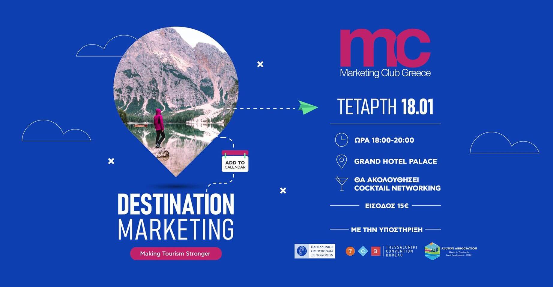 Το Marketing Club Greece, που είναι Σύλλογος Εξειδικευμένων Στελεχών Marketing και Διοίκησης Επιχειρήσεων, οργανώνει την ημερίδα «Destination Marketing – Making Tourism Stronger», την Τετάρτη 18 Ιανουαρίου, στις 6 το απόγευμα, στο ξενοδοχείο Grand Hotel Palace (Μοναστηρίου 305, Θεσσαλονίκη).