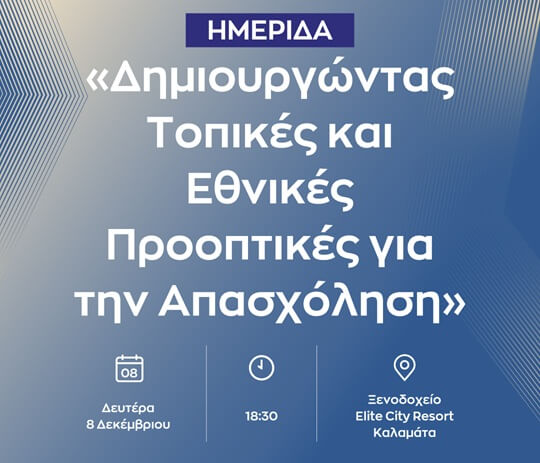 Τη Δευτέρα, 8 Δεκεμβρίου 2025 στο Elite City Resort στην Καλαμάτα, θα πραγματοποιηθεί ημερίδα με τίτλο: «Φιλοξενία με Αξία για ‘Oλους: Δημιουργώντας Τοπικές και Εθνικές Προοπτικές για την Απασχόληση».