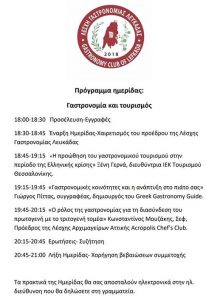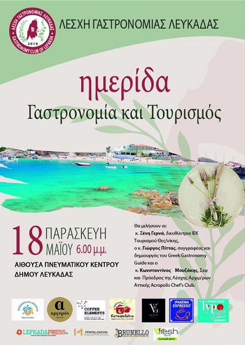 Η Λέσχη Γαστρονομίας Λευκάδας οργανώνει την Παρασκευή 18 Μαΐου 2018, στις 6 το απόγευμα, στην αίθουσα του πνευματικού κέντρου Λευκάδας, ημερίδα με θέμα: «Γαστρονομία και Τουρισμός».