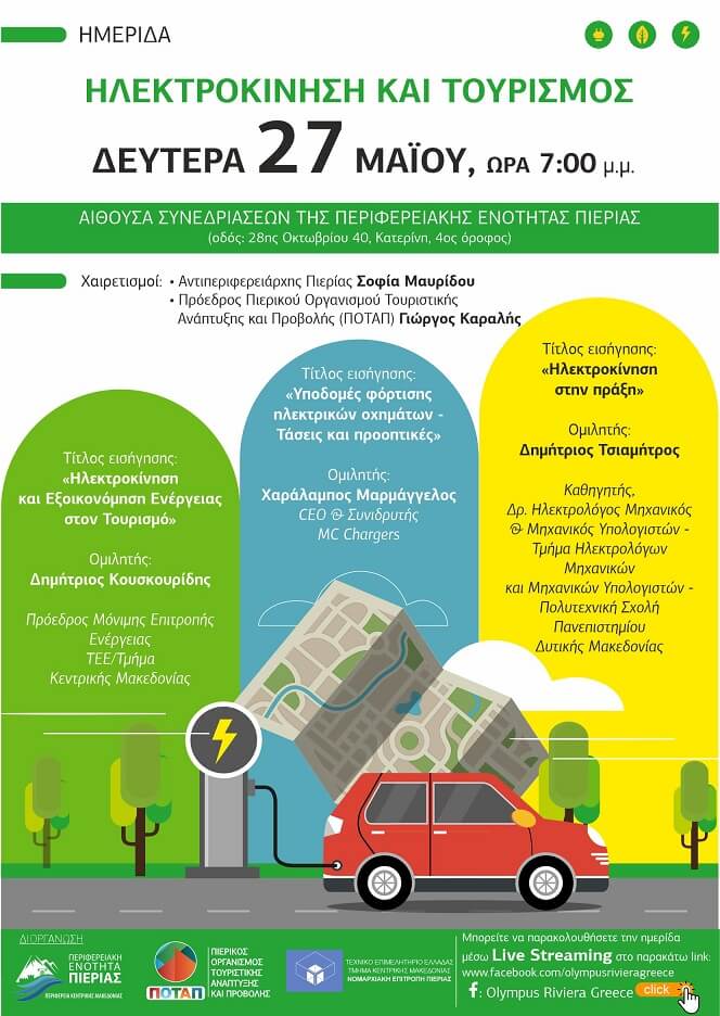 Η Περιφερειακή Ενότητα Πιερίας, ο Πιερικός Οργανισμός Τουριστικής Ανάπτυξης και Προβολής (ΠΟΤΑΠ) και η Νομαρχιακή Επιτροπής Πιερίας του Τεχνικού Επιμελητηρίου Ελλάδας / Τμήμα Κεντρικής Μακεδονίας, οργανώνουν την ενημερωτική ημερίδα με θέμα: «Ηλεκτροκίνηση & Τουρισμός».