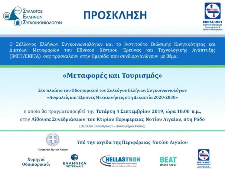 Ημερίδα με τίτλο «Μεταφορές και Τουρισμός» θα πραγματοποιηθεί στις 4 Σεπτεμβρίου 2019, ώρα 10:00 και ημέρα Τετάρτη στην Αίθουσα Συνεδριάσεων του Κτιρίου Περιφέρειας Νοτίου Αιγαίου, στη Ρόδο.