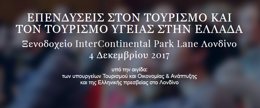 Ημερίδα με τίτλο «Investment Opportunities in Greece in Tourism and Healthcare 2017», οργανώνεται στο Λονδίνο, που είναι πρωτοβουλία ιδιωτικών εταιρειών από την Ελλάδα και τη Βρετανία, υπό την αιγίδα των Υπουργείων Τουρισμού και Οικονομίας & Ανάπτυξης και τη στήριξη της Πρεσβείας της Ελλάδας στη βρετανική πρωτεύουσα, του Enterprise Greece και του Ελληνικού Οργανισμού Τουρισμού (ΕΟΤ).