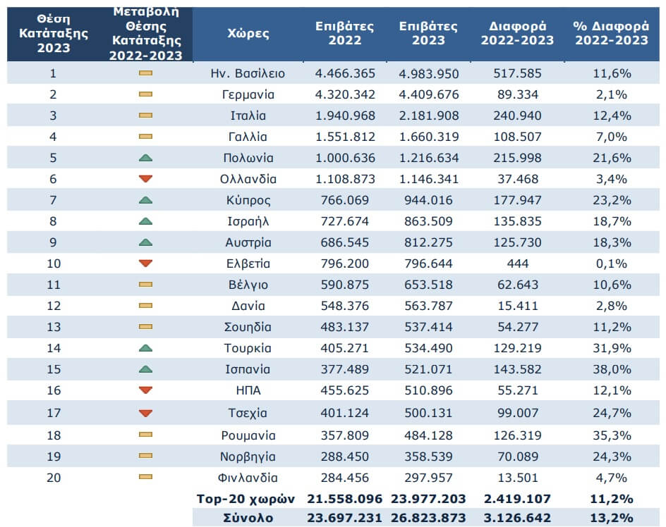 O συνολικός αριθμός των αεροπορικών αφίξεων από το εξωτερικό το 2023 έφθασε τα 26,8 εκατ. παρουσιάζοντας αύξηση +13,2%/+3,1 εκατ. σε σχέση με το 2022 που είχαν καταγραφεί 23,7 εκατ. επιβάτες.