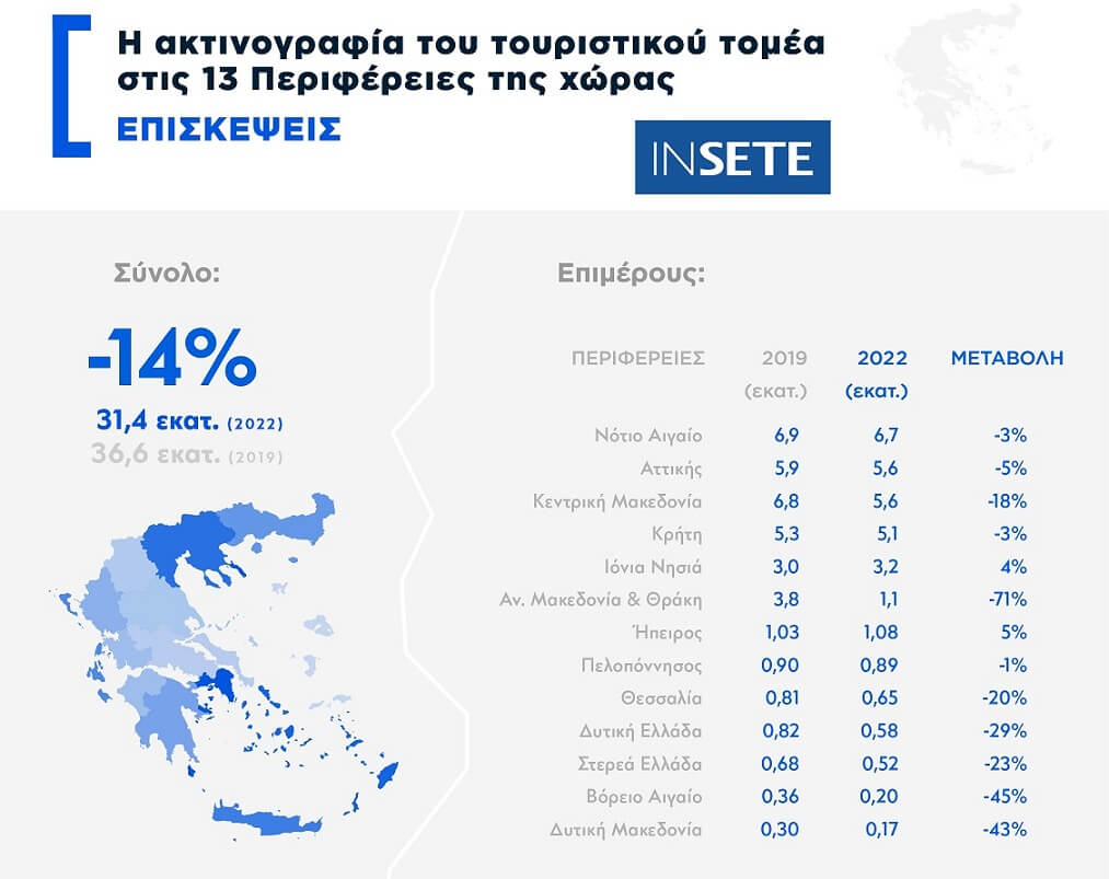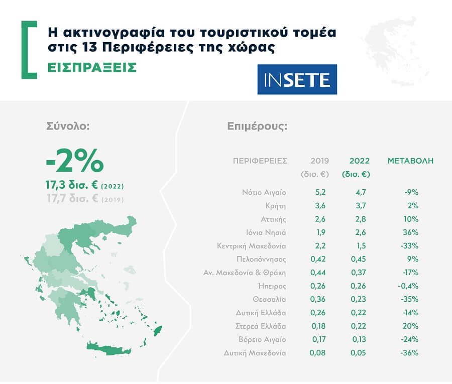 Ειδικότερα, ανά Περιφέρεια οι επισκέψεις, οι τουριστικές εισπράξεις και η μέση δαπάνη ανά επίσκεψη στην Ελλάδα και το ποσοστό μεταβολής μεταξύ 2019 και 2022 διαμορφώθηκαν ως εξής: