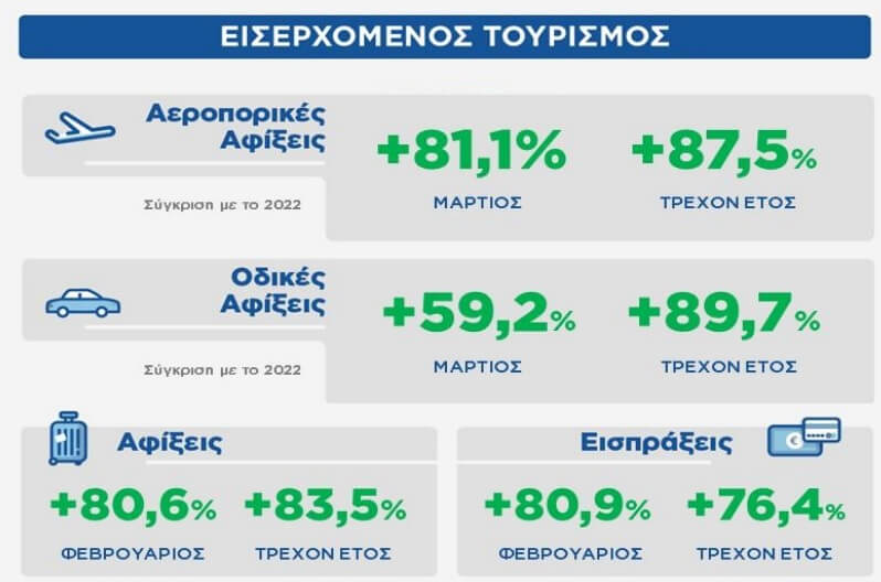 Την περίοδο Ιανουαρίου – Μαρτίου του 2023, καταγράφηκαν 1,4 εκατ. διεθνείς αεροπορικές αφίξεις, ξεπερνώντας τα επίπεδα του Ιανουαρίου – Μαρτίου του 2022, κατά 87,5%/+646.000 αφίξεις, ενώ σε σύγκριση με την περίοδο Ιανουαρίου – Μαρτίου του 2019 η αύξηση υπολογίζεται σε 12,8%, σύμφωνα με το Στατιστικό Δελτίο (Νο. 81, Απρίλιος 2023) του Ινστιτούτου του Συνδέσμου Ελληνικών Τουριστικών Επιχειρήσεων (ΙΝΣΕΤΕ).