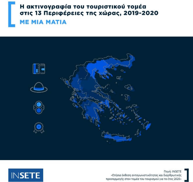 Το εύρος της μείωσης των τουριστικών μεγεθών ανά Περιφέρεια της χώρας, την πρώτη χρονιά της πανδημίας, αποτυπώνεται, μεταξύ άλλων, στην τρίτη έκδοση των Ετήσιων Εκθέσεων Ανταγωνιστικότητας και Διαρθρωτικής Προσαρμογής στον Τομέα του Τουρισμού των 13 Περιφερειών της χώρας που έδωσε στη δημοσιότητα το Ινστιτούτο του Συνδέσμου Ελληνικών Τουριστικών Επιχειρήσεων (ΙΝΣΕΤΕ).