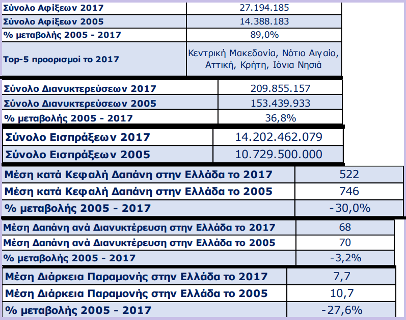 Τα παραπάνω είναι ανάμεσα στα σημαντικότερα συμπεράσματα της μελέτης του Ινστιτούτου του Συνδέσμου Ελληνικών Τουριστικών Επιχειρήσεων (ΙΝΣΕΤΕ), με τίτλο: «Εξέλιξη μεγεθών και δεικτών εισερχόμενου τουρισμού στην Ελλάδα από τις κύριες αγορές της, 2005 – 2017».