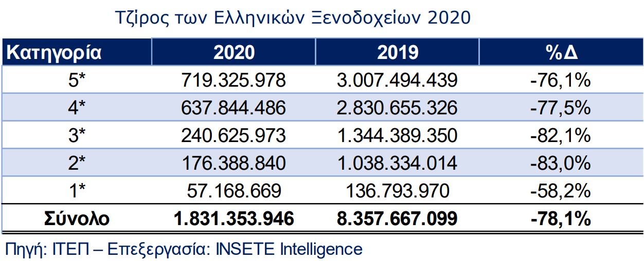 Η μεγαλύτερη ποσοστιαία μείωση σημειώθηκε στην κατηγορία των 2 αστέρων με το τζίρο να μειώνεται κατά 83% φτάνοντας μόλις τα 176 εκατ. ευρώ έναντι 1 δισ. ευρώ το 2019.