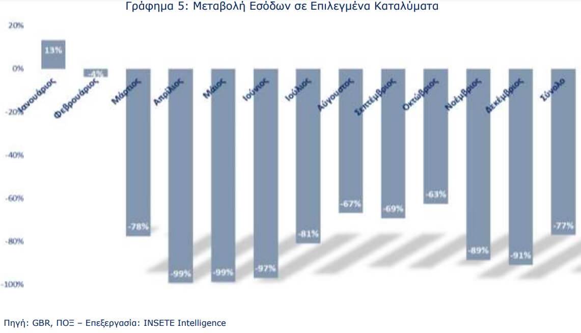 Ειδικότερα στα ξενοδοχεία 5 αστέρων τα έσοδα το 2020 ήταν 719 εκατ. ευρώ έναντι 3 δισ. ευρώ το 2019, σημειώνοντας μείωση 76,1%.