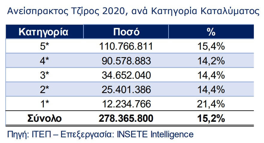 Ειδικότερα στην κατηγορία των 5 αστέρων τα ανείσπρακτα έσοδα εκτιμώνται σε 111 εκατ. ευρώ ή σε 15,4% του συνόλου της κατηγορίας.
