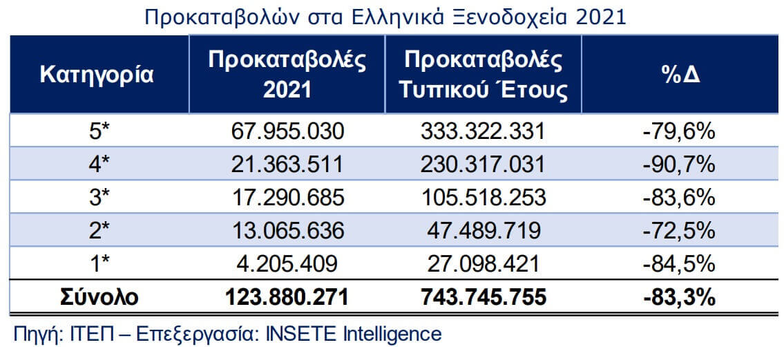 Στην κατηγορία των 3 αστέρων οι προκαταβολές για το 2021 ανέρχονται σε 17 εκατ. έναντι 105 εκατ. σε ένα τυπικό έτος παρουσιάζοντας μείωση 83,6%.