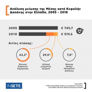Έτσι, τα παραπάνω είχαν ως αποτέλεσμα τη μείωση της μέσης δαπάνης ανά τουρίστα μεταξύ 2005 και 2018 κατά 30% (2005: 745,7 ευρώ, 2018: 519,6 ευρώ).
