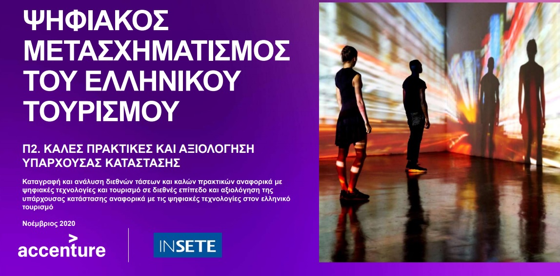 Αυτά είναι τα βασικά συμπεράσματα της μελέτης του ΙΝΣΕΤΕ και της Accenture με τίτλο: «Ψηφιακός Μετασχηματισμός του Ελληνικού Τουρισμού – Στρατηγικός Οδικός Χάρτης» που παρουσιάστηκε την Πέμπτη 27 Μαΐου 2021.