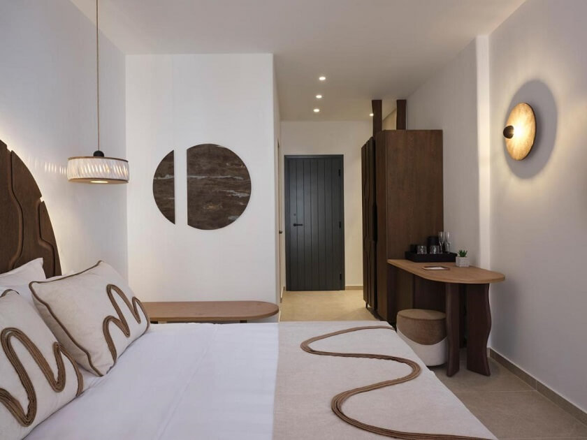 Τα 21 δωμάτια και σουίτες διαθέτουν μοντέρνα αισθητική, με φουτουριστικά χειροποίητα έπιπλα και γήινες αποχρώσεις που συνδυάζουν ξύλο και πέτρα, δημιουργώντας μια ατμόσφαιρα χαλάρωσης και εκλεπτυσμένου στυλ.
