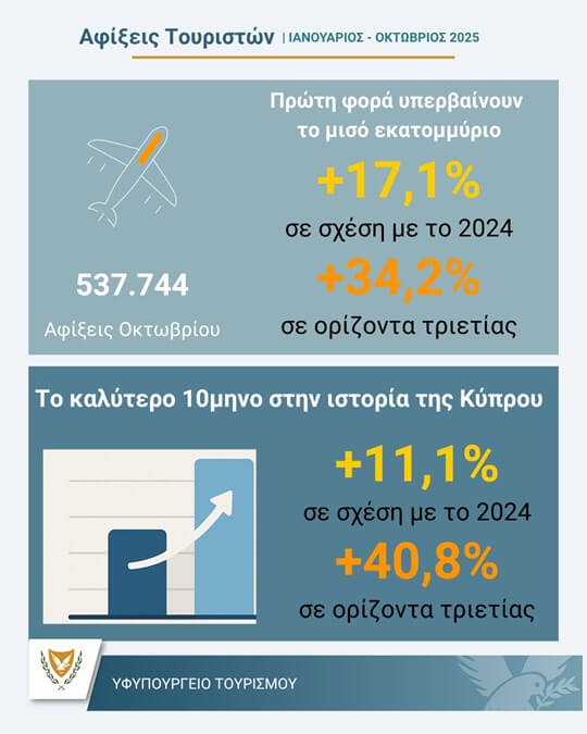 Σύμφωνα με την Κυπριακή Στατιστική Υπηρεσία, οι αφίξεις τουριστών το φετινό Οκτώβριο ανήλθαν σε 537.744 σε σύγκριση με 459.106 τον Οκτώβριο του 2024, σημειώνοντας αύξηση 17,1%.