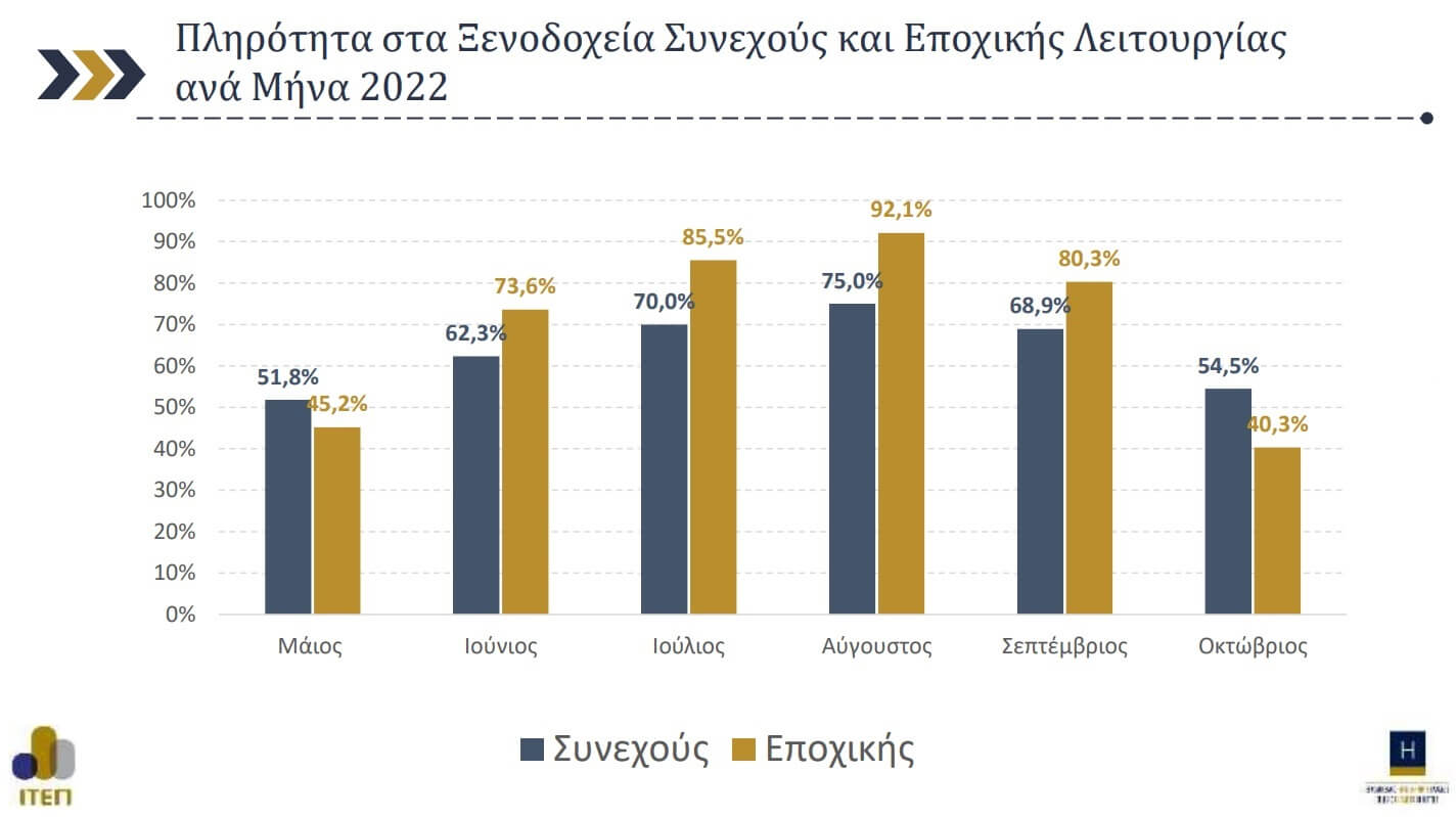 – Η μέση πληρότητα τον Αύγουστο του 2022 ξεπέρασε οριακά αυτήν του αντίστοιχου μήνα του 2019, με 88% και 86,8% αντίστοιχα.